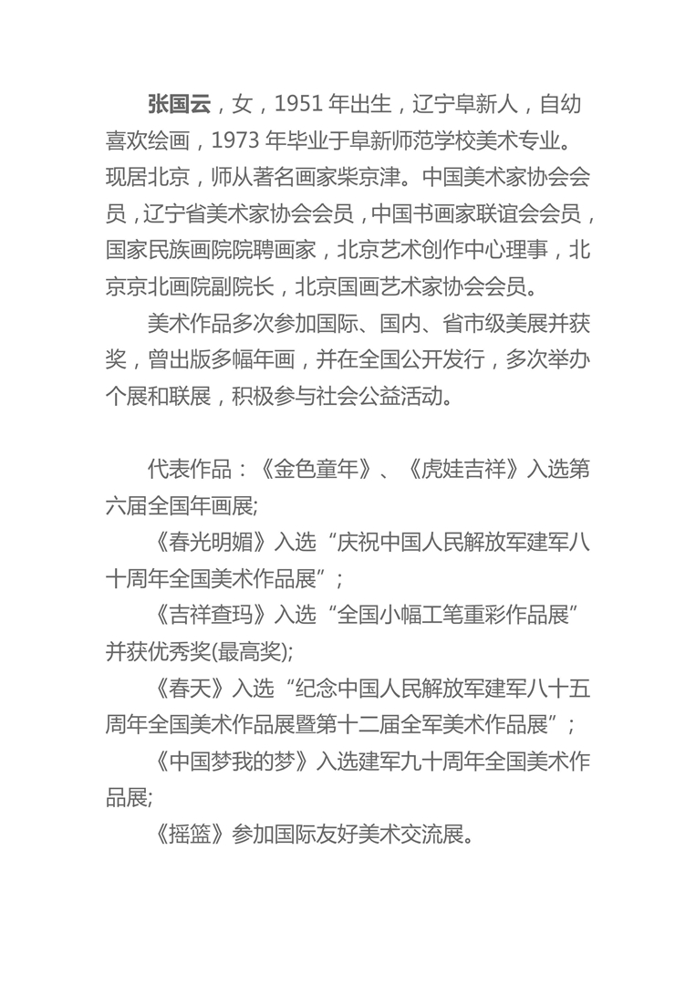 张国云,女,1951年出生,辽宁阜新人,自幼喜欢绘画,1973年毕业于阜新师范学校美术专业。现居北京,师从著名画家柴京津。中国美术家协会会员,辽宁省美术家协会会员,中国书画家联谊会会员,国家民族画院院聘画家,北京艺术创作中心理事,北京京北画院副院长,北京国画艺术家协会会员。