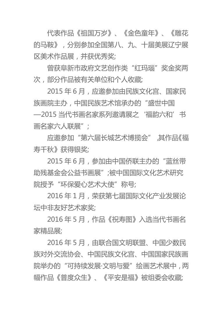 2015年6月,应邀参加由民族文化宫、国家民族画院主办,中国民族艺术馆承办的“盛世中国—2015当代书画名家系列邀请展之‘福韵六和’书画名家六人联展”;