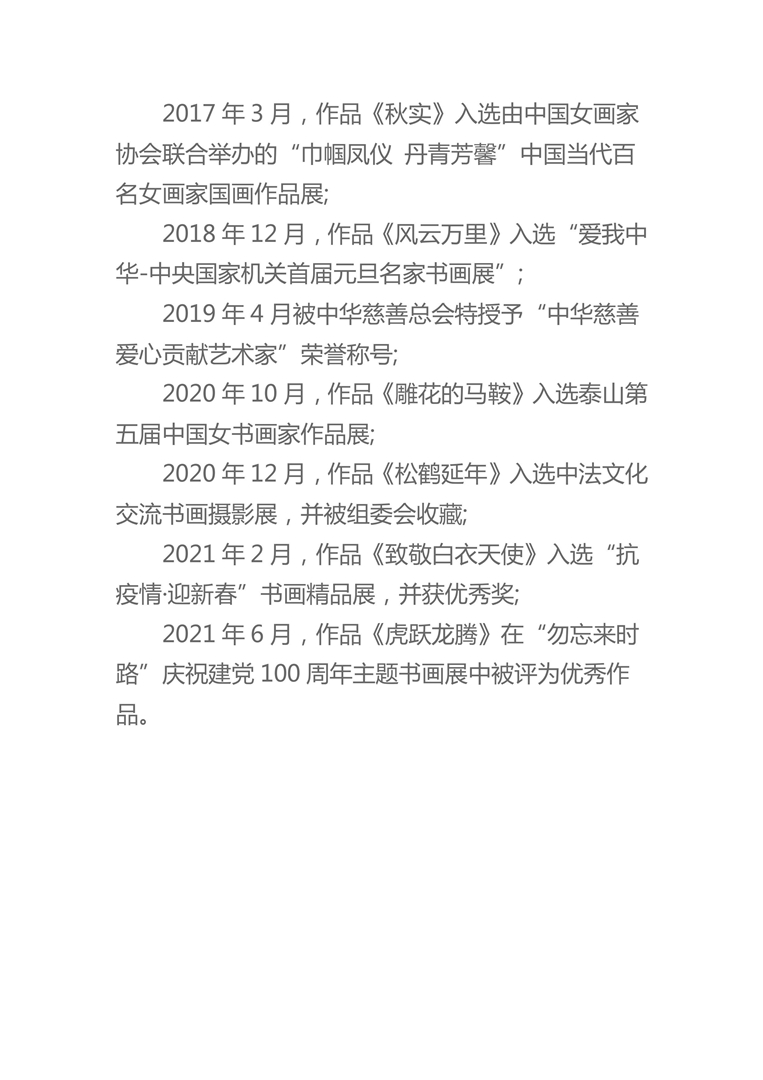2017年3月,作品《秋实》入选由中国女画家协会联合举办的“巾帼凤仪 丹青芳馨”中国当代百名女画家国画作品展;